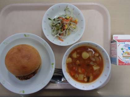 牛乳 コロッケバーガー 大根とツナのサラダ ミネストローネ