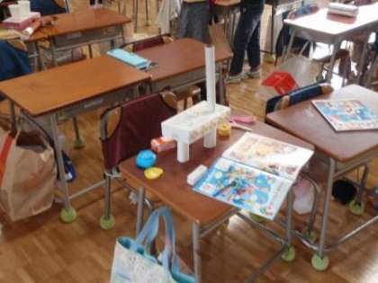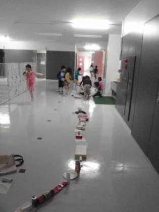 その箱などを使って、ならべてつなげて…どこまでいくのかな?