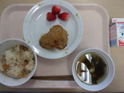 牛乳 竹の子ごはん 豆腐いりさくさくつくね すまし汁 いちご