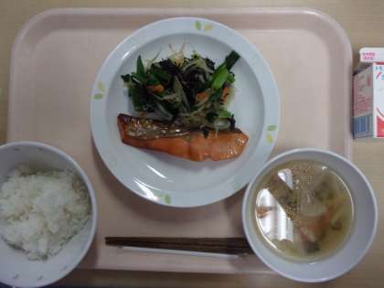 牛乳 ごはん 魚の照り焼き 野菜ののりあえ 吉野汁