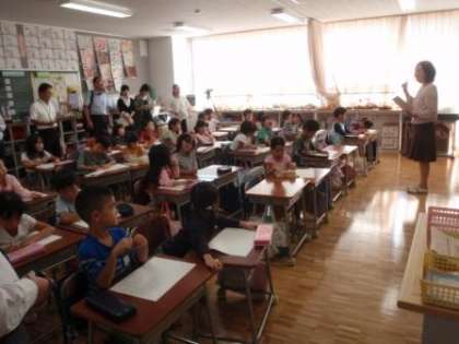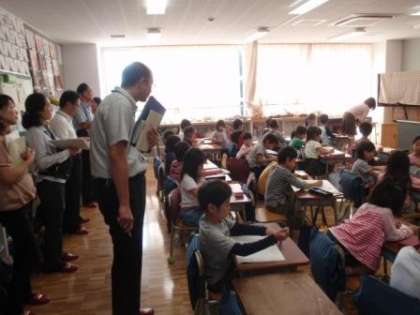担任だけでなく、校長だけでなく、初めて見る他の学校の先生たちに囲まれての授業でした。