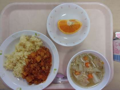 ☆今日は愛媛県の「清美オレンジ」を出しました。ボリュームのあるアメリカのオレンジと、甘い日本の温州みかんからつくられたみかんです。みずみずしく、甘いオレンジで子供たちもよく食べていました。疲れがたまるこの時期、ビタミンをしっかりととって疲れを癒やしてほしいです。