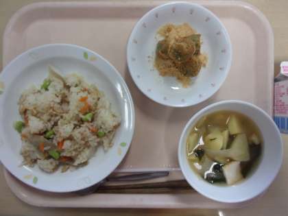 牛乳 かやくごはん じゃが芋の味噌汁 よもぎ団子