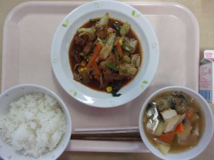 ☆今日は岐阜県の郷土料理の「けいちゃん焼き」を出しました。鶏肉を味噌やしょうゆベースのたれに漬け込み、キャベツや玉ねぎなどの野菜といためた料理です。