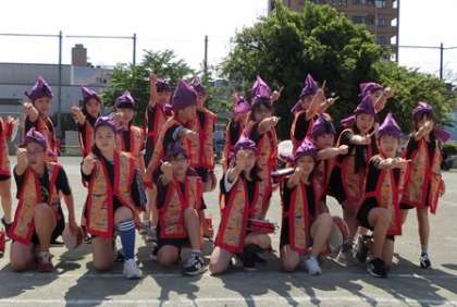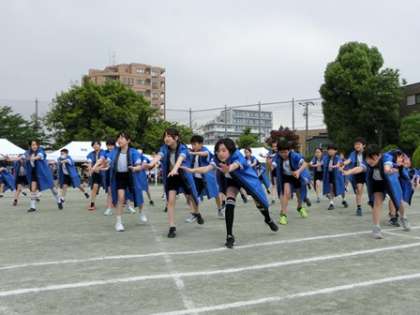 5年生は、日本の伝統的なソーラン節を踊りました。腰を低く落とす動きは、見た目以上にきつかったと思うのですが、全力で踊る姿が本当にクールでした。青い法被(はっぴ)に自分で決めた漢字を書き、その思いがたくましい動きから会場に伝わってきました。