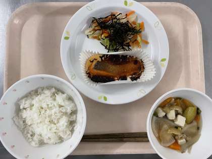 牛乳 ごはん 魚のみそマヨネーズ焼き 梅のりあえ けんちん汁