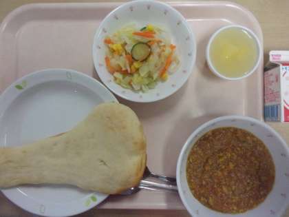 ☆今日は、「ナン」と「キーマカレー」を出しました。「ナン」を初めて食べるという子もいて興味津々の様子でした。また、今日の「りんごゼリー」は、りんごがゴロっと入ったゼリーにしました。りんごをミキサーにかけるか迷いましたがとても人気だったので、次出すときもゴロっとりんごが入った「りんごゼリー」にしようと思います。