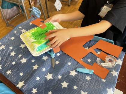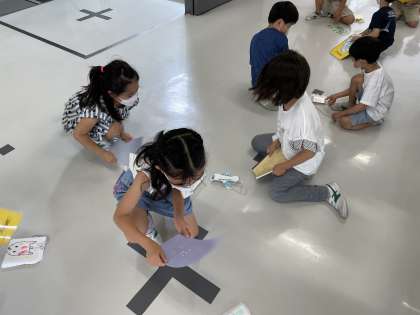 今週の図画工作は「ふわふわゴー」をしました。おうちから持ってきてもらったトレイに、画用紙やペンを使って絵を描いたり、飾り付けしました。うさぎや車などオリジナルの作品に仕上げて、友達同士で教科書をあおぎ、「よぉい、どん!」と競争したり、動かすことを楽しんだりしました。子供たちの弾ける笑顔がいっぱいでした☆