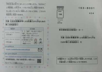 でも、何かあったとしても、知っている人には相談しにくい、と思う人がいるかもしれません。今年の4月から、学校の中で嫌な思いをしたのに、誰にも相談できない人のために、秘密で相談を聞いてくれるところができました。今日、みなさんに「相談シート」というプリントを配ります。近くの人に相談したくないときは、その紙に書いてある電話番号や、メールアドレスに連絡してください。その紙に相談したいことを書いて、切手なしで、郵便で送ることもできます。