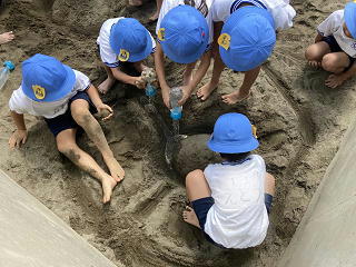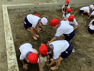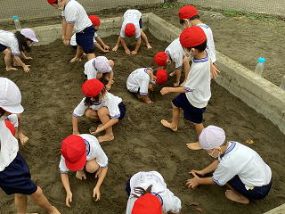 子供たちは、砂を触って「さらさらだね。」「砂の中は冷たいね。」などたくさんのことを発見していました。水と砂を混ぜて泥団子を作ったり、砂の山を作って友達とトンネルを掘ったりと楽しく活動していました。学習が終わると砂まみれになりながら、にっこり笑顔で「楽しかった。」「もっと、やりたい。」と満足そうでした。