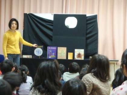 今回は、読み聞かせ『びっくりまつぼっくり』・語り『さんまいのおふだ』『山いっぱいのきんか』・ペープサートシアター『お月さまってどんなあじ?』・詩『ちゅうしゃ』というプログラムでした。