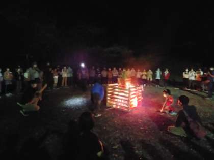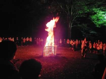 キャンプファイアが始まりました。真っ暗な夜に火が灯り、子供たちは歌ったりゲームをしたり楽しんでいます。