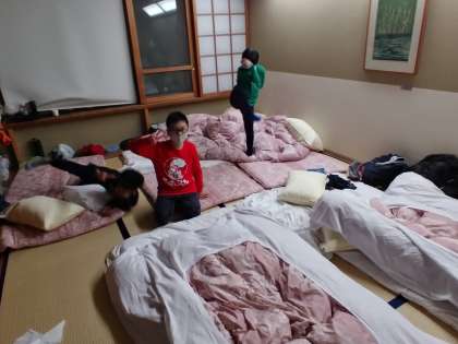 いよいよ就寝準備です。整頓係が、シーツの扱い方を聞いて、班の友達に伝えます。初めて布団を自分で敷く子も、頑張っています。