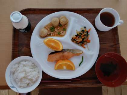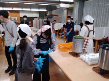 朝食です。食事係が配膳し、美味しくいただきました。川場村特産の飲むヨーグルトが大人気で、おかわりじゃんけんで盛り上がりました。みんな、よく食べています。