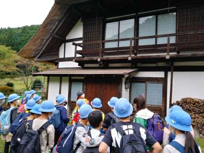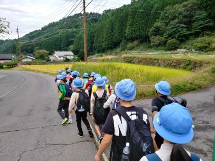 村めぐりに出発しました。朝の小雨も上がり、ハイキングにはぴったりの爽やかな天候です。水田には、稲穂が実っています。