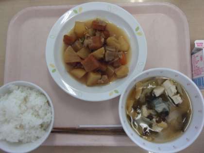 牛乳 ごはん じゃが芋と鶏肉の煮物 みそしる