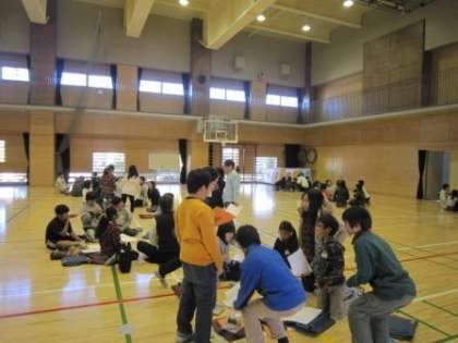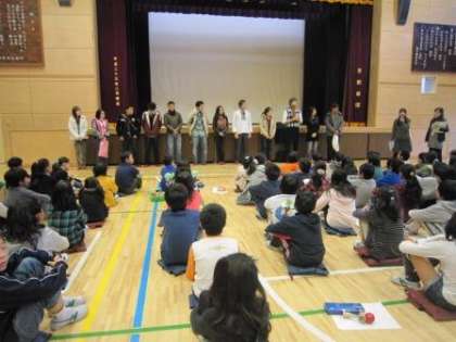 会の最初は、留学生さん達が日本語を話せることは内緒だったので、子どもたちはドキドキです!身振り手振りをつけて一生懸命校舎の案内や、日本語で調べている日本の「衣食住」についての発表をしました。