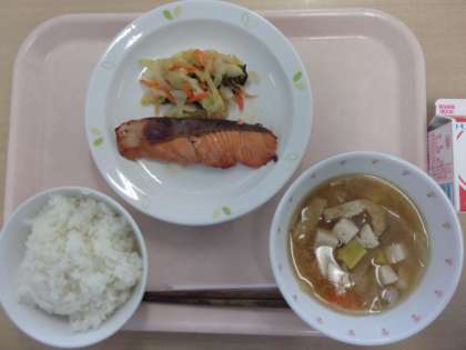 ☆今日の「魚の塩麹焼き」は人気でどこのクラスもよく食べていました。鮭を酒やしょうが、みりん、塩麹、しょうゆで漬けて焼きました。