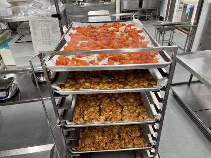 ☆今日の「チキントマトシチュー」は煮込む前に、調理員さんが鶏肉とトマトをオーブンで焼いてくれました。一度オーブンで焼くことで、トマトは形が残ったまま酸味をとばすことができ、美味しくできました。子供たちもたくさん食べてくれていました。