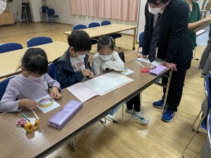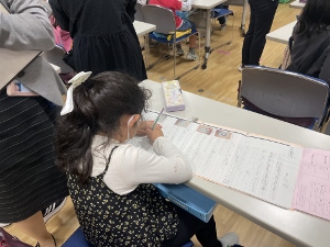 友達が書いた説明文を読みながら実際におもちゃを作るので、「これってどこのこと?」「何cmがいいの?」など、質問が出たところに言葉を付け足していました。完成した説明文は、友達や保護者の方に渡しておもちゃ作りをしてもらいます。おもちゃを作って楽しんでもらえるよう、2年生たちは一生懸命書いていました。