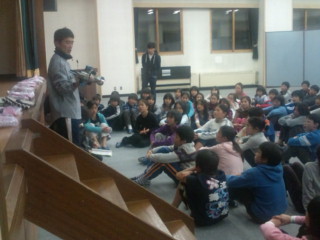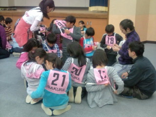 スキー班ごとに集まって、明日からの練習の目標を確認し合いました。ゼッケンのつけ方も練習しました。