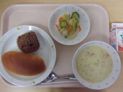 牛乳 ミルクパン かぼちゃシチュー フレンチサラダ ココアケーキ