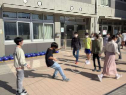 晴天の中、3年生は音楽に合わせてランニング、6年生は長縄の練習をしていました。