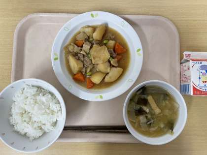 牛乳 ごはん じゃが芋と凍り豆腐の旨煮 油揚げの味噌汁