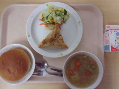 牛乳 丸パン サモサ コーンサラダ レンズ豆のスープ