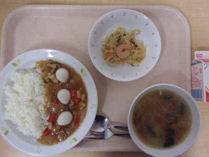 ☆今日はタイの料理を出しました。「ガパオライス」も「ヤムウンセン」もタイの料理です。「ガパオライス」は鶏肉とバジル、野菜など炒めた具材をごはんにかけました。「ヤムウンセン」はゆでた春雨とえびが入った「タイ風の春雨サラダ」です。新メニューだったので心配でしたが、子供からも大人からも好評でよく食べていました。