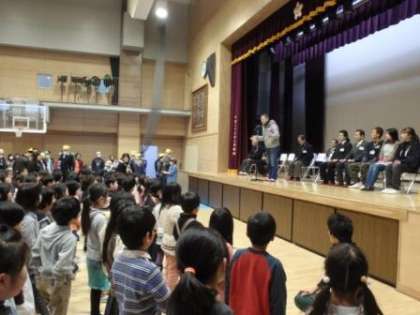 寒餅会の歴史の話を聞き、町会長さんの挨拶を聞き、感謝の意を込めて作った色紙を渡し、校歌を歌いました。