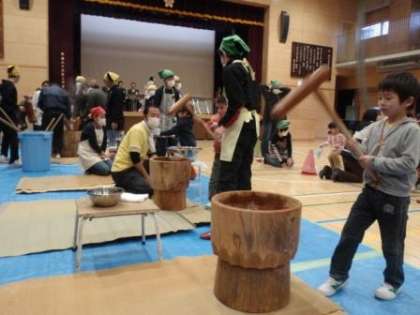 小さな臼と杵で餅をペッタンペッタンと一人5回つきました。