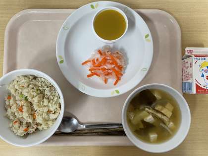 牛乳 鶏肉とごぼうのごはん ゆず大根 味噌汁 かぼちゃようかん