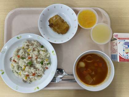 牛乳 三色ピラフ タンドリーチキン ミネストローネ セレクトデザート(みかんゼリーorりんごゼリー)