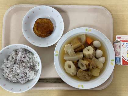 ☆今日は「おでん」を出しました。寒い季節に食べたくなる料理の一つです。今日は特に寒かったので「おでん」が体に染みたのではないかと思います。具は、だいこん、にんじん、じゃが芋、がんもどき、ちくわ、ちくわぶ、かまぼこ、こんにゃく、にたまごが入っていました。また、「いももち」はじゃが芋、バター、でんぷんでマッシュポテトを作り、油で揚げ、甘辛のたれをかけて作りました。子供からとても人気でよく食べていました!