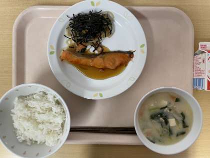 牛乳 ごはん 魚の幽庵焼き 野菜ののりあえ 飛鳥汁