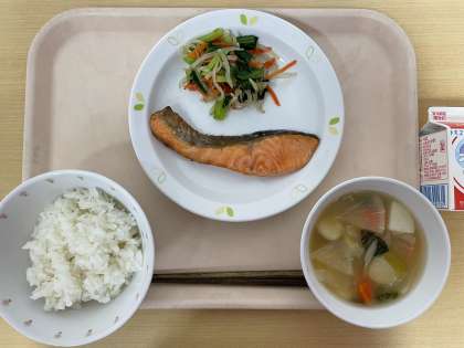牛乳 ごはん 鮭の塩焼き お浸し 味噌すいとん汁