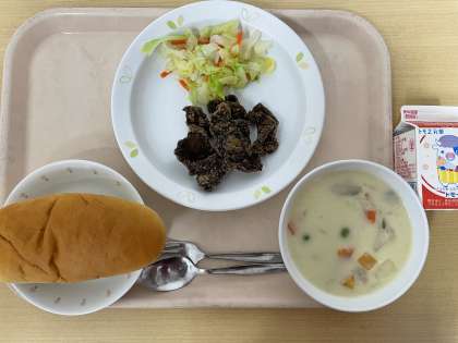 牛乳 コッペパン くじらの竜田揚げ ボイルキャベツ クリームスープ
