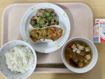 牛乳 ごはん 鮭のちゃんちゃん焼き 野菜のゆかりかけ けんちん汁