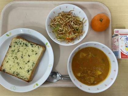 牛乳 ガーリックトースト ポークシチュー じゃが芋のハニーサラダ みかん