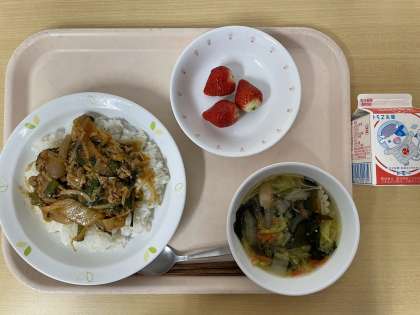 牛乳 豚キムチ丼 中華スープ いちご