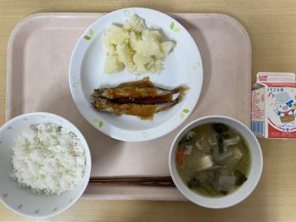 牛乳 ごはん ししゃものバーベキューソース 粉ふきいも 豚汁