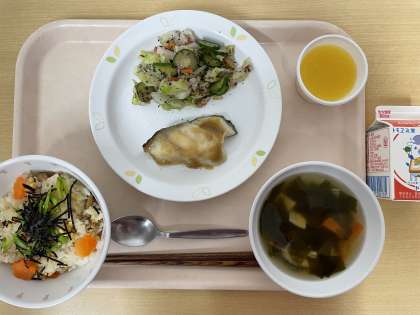 牛乳 ちらし寿司 魚の西京焼き 野菜のゆかりかけ 竹の子のすまし汁 ももゼリー