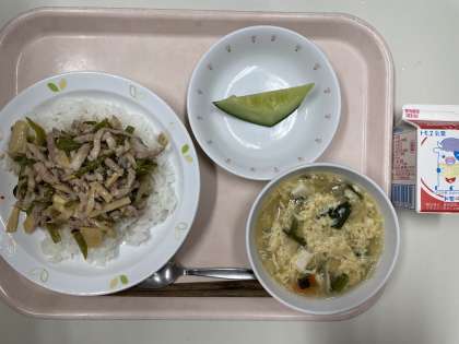 牛乳 チンジャオロース丼 にらたまスープ メロン