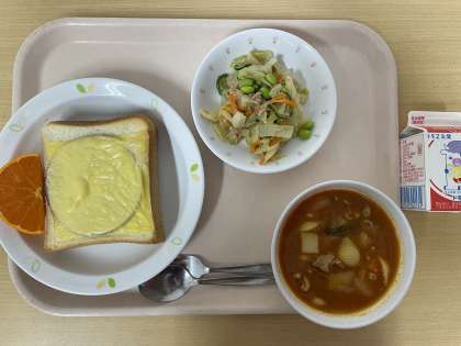 牛乳 ハムチーズトースト ミネストローネ ツナと枝豆のサラダ せとか