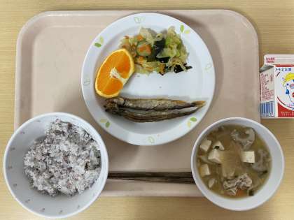 牛乳 ゆかりごはん ししゃもの唐揚げ 和風サラダ 僧兵汁 清美オレンジ