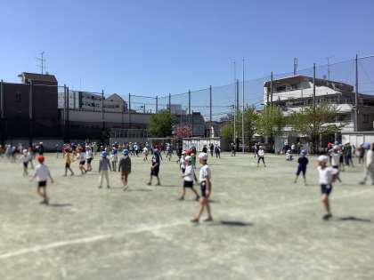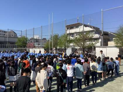 晴天の中、約3年ぶりに校庭で全校朝会がありました。高学年は素早く整列し、話の聞き方も立派でした。