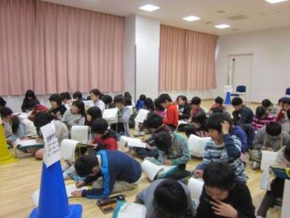 写真は、ゲストの方の話に耳を傾け、熱心にメモを取る子どもたちの姿です。