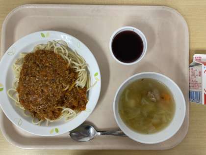 牛乳 スパゲティミートソース コンソメスープ ぶどうゼリー