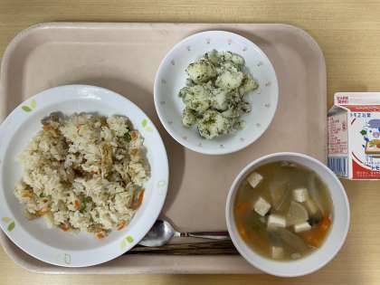 ☆今日はきつねの好物と言われている「油揚げ」の入った「子ぎつねごはん」を出しました。今日も、もりもり食べてくれていました。